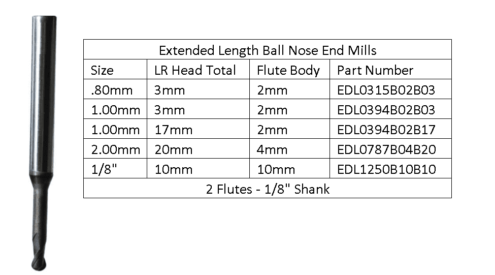 CRT currently stocks the following two-flute-extended-length ball nose end mills.