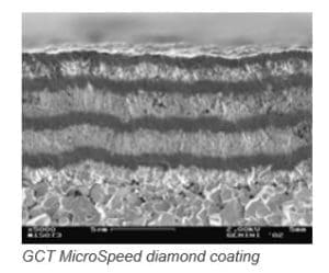 The GCT MicroSpeed diamond coating is composed of different crystalline and nano-crystalline layers. The MicroSpeed coating is built up in different thickness and layers depending on application, tool diameter and geometry.