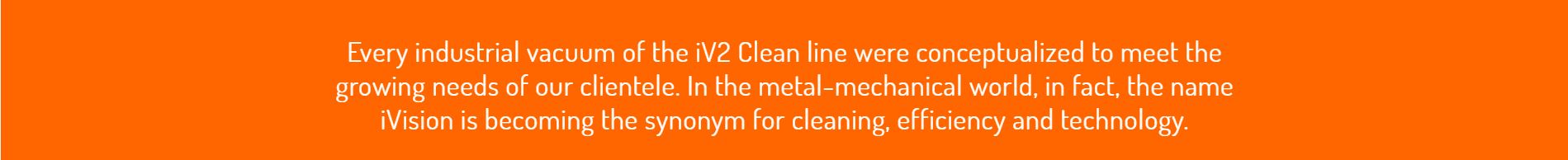 The industrial vacuums of the iV2 Clean line are the most sold wheelable iVision vacuums and are used for intensive collecting of dust and chips (also mixed with oil) generated from the machine tools in metal-mechanical industries and warehouses. This range of industrial vacuums uses side-channel turbines and is used with great success in the world of metal working. Nearly every mechanical office needs an industrial vacuum system and it’s for this reason that iVision proposes as a trustworthy and competent manufacture to be in grade of satisfying the needs of their clients. In addition to the already ample range of wheeled industrial vacuums with side-channel turbines, iVision has created a product with a multitude of specific accessories specific for the world of industrial dust collection related to the iV2 clean line, that render the product ideal for use in every metal-mechanical warehouse. The extremely low level of noise, the ease of maintenance and above all, the design and use of Italian engine manufacturing, are all part of the fundamental characteristics of the iVision industrial vacuums.
