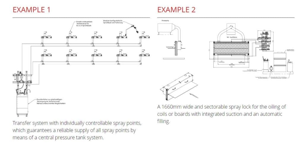 Our spray lock technology is designed for constant, even, thin-film oil application to strips, coils, circuit boards or geometric surfaces such as profiles, round bars, pipes, cables, etc.
